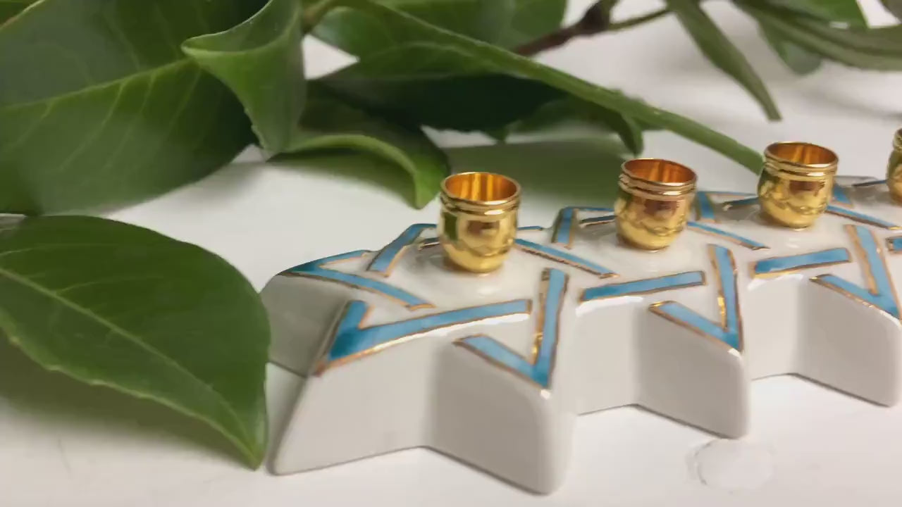 This handcrafted blue bird porcelain menorah is made with gold-plated metal candle cups. The stars are connected to reflect the way the members of the Jewish community are connected; embracing and supporting each other.