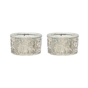 Beautifully made for tea light candles, this pair of Tea Light Holders with Metal Cutout of Jerusalem is made from glass. On the glass is a metal cutout of Jerusalem, in stainless steel.