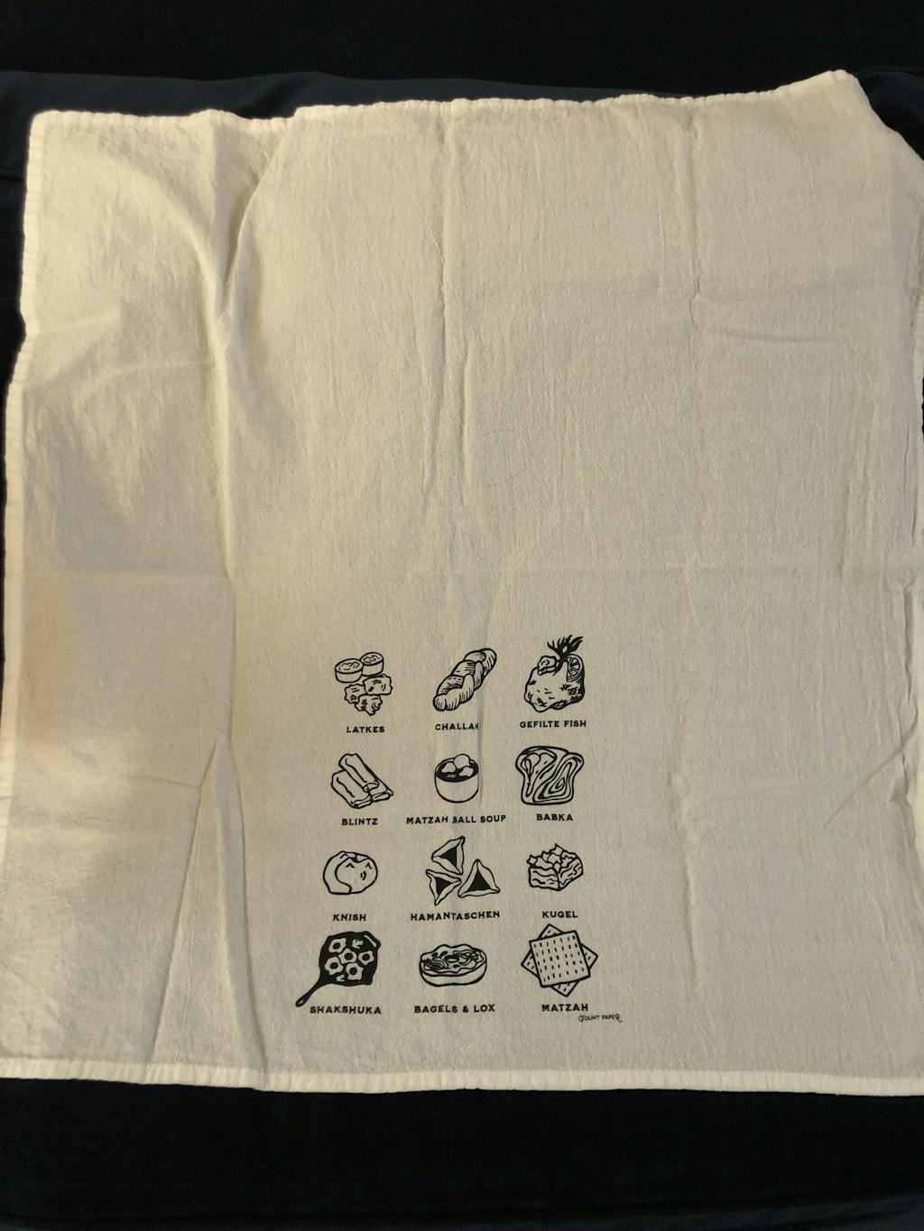 Tea towels are hand-screen printed in Utah and highlight all of your favorite Jewish foods. From latkes to kugel. Items are shipped gift ready folded and secured with a belly band.