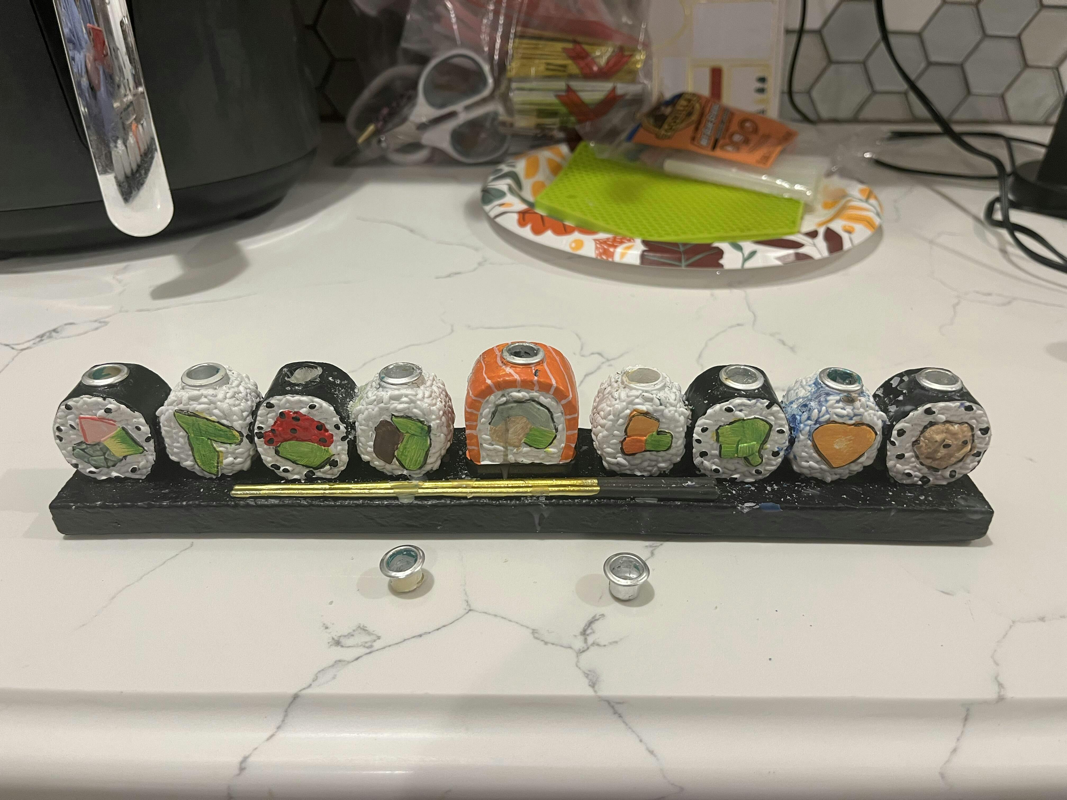Hanukkah comes alive with a delightful Sushi Menorah that's as fresh and flavorful as it gets! Crafted with intricate attention to detail, it's a masterpiece that resembles the real deal. Whether you're a sushi aficionado or just sharing the joy of Hanukkah with friends, this delectable menorah allows you to step into the role of a "Sushi Master" and celebrate in style.