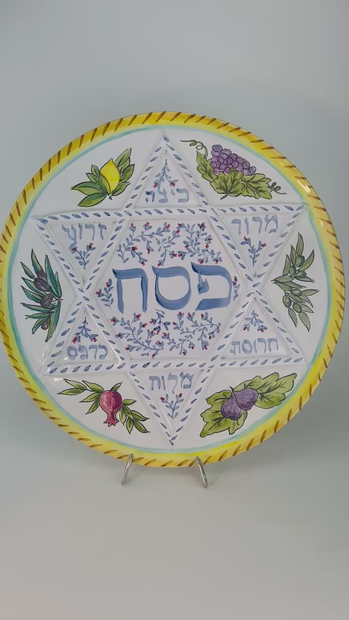 The Star of the Seder. Celebrate the beauty of spring and Passover with this vibrant Seven Species Handmade Seder Plate Set by California artist Liz Lauter. Featuring colorful painted designs of Biblical fruits: pomegranates, dates, figs, lemons, grapes, and olives and Hebrew lettering in the plate's large Star of David names the six ceremonial foods for the Seder Plate.