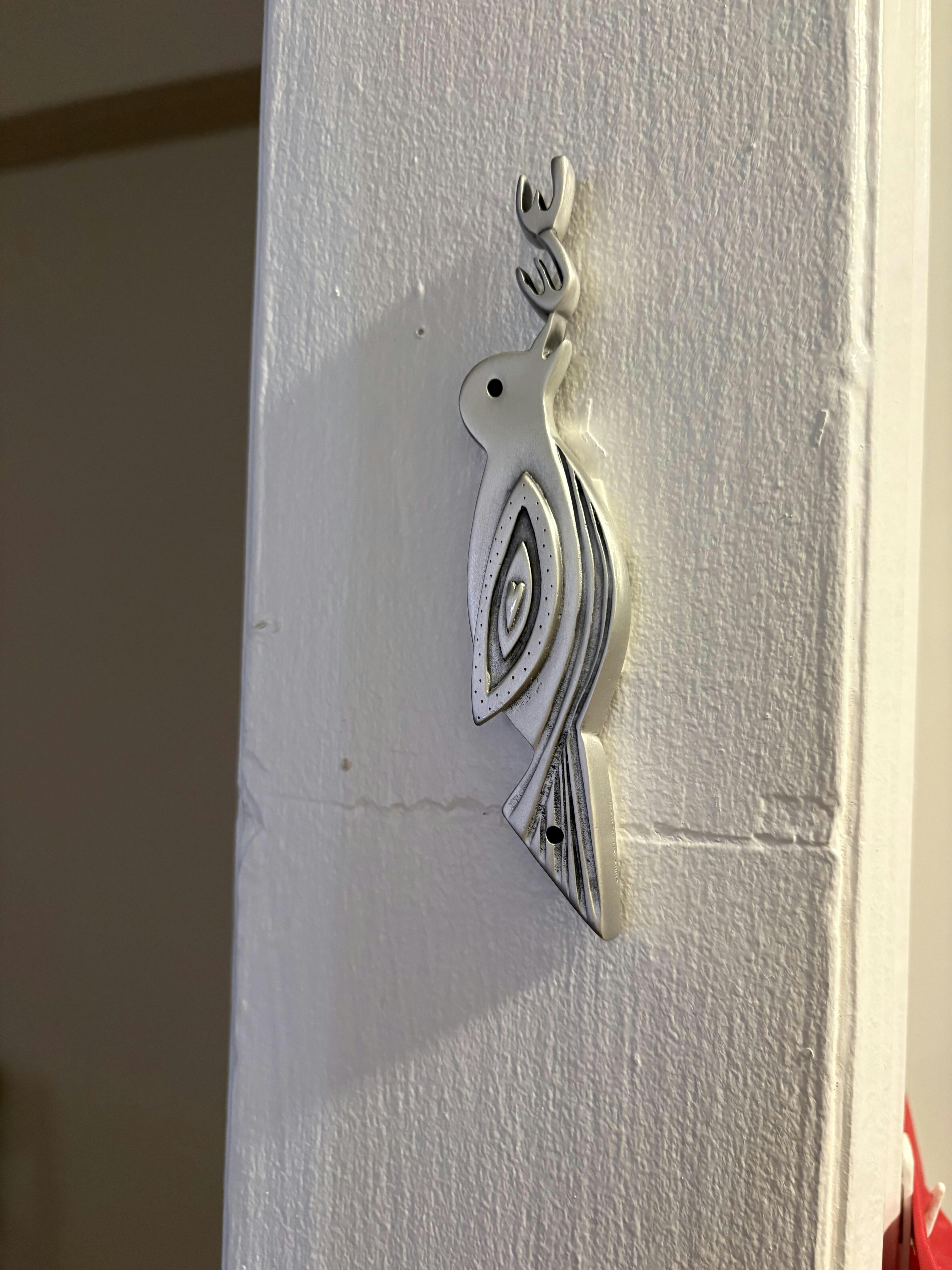 The songbird is singing out shins, the 26th letter of the Hebrew alphabet that you often see on mezuzah cases. Emily Rosenfeld makes pewter Judaica that is modern with a touch of whimsy. Her mezuzot are hand cast pewter and can be hung indoors or out. Made in the USA.