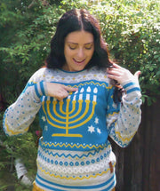 The festive blue, yellow and gray Women's Reversible Sequin Sweater gives you the best of both worlds with the simple swipe of your hand. Simply swipe the sequins to "light" the menorah and have the correct number of candles lit. So cool - have your latkes and eat it, too!